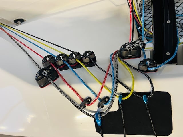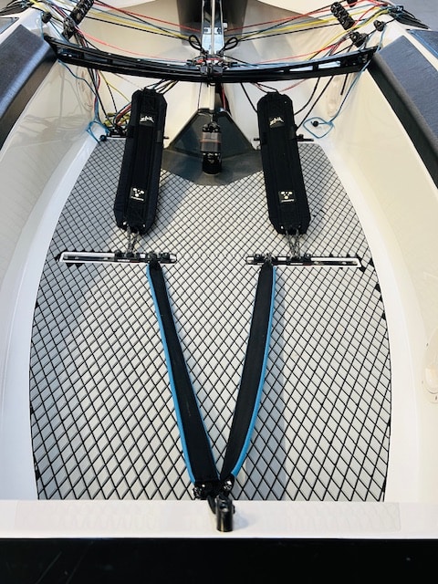 - White with black deck with white hull and grey floor- White hull - White interior with grey floor - Two Automatic Bailers - Zhik hiking straps - Black Traveller case - Black Devoti boom - Carbon Hiking Extenders - Carbon Calf Extenders - White rudder with Alu tiller - Alu joystick - One drainpipe - Grey centerboard - Harken blocks and Harken traveller - Black CB case - All covers - Steel trolley - boat is in good condition